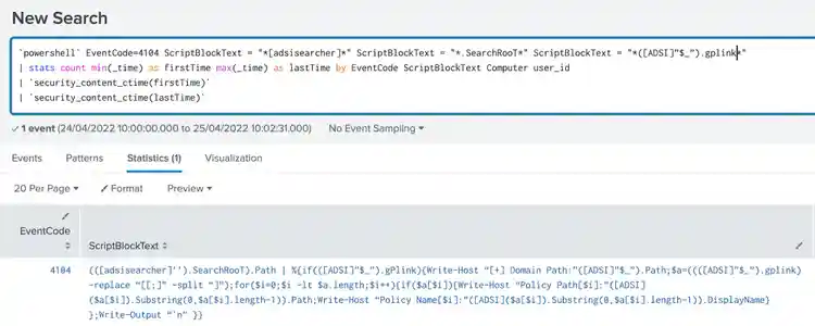 `powershell` EventCode=4104 ScriptBlockText = "*[adsisearcher]*" ScriptBlockText = "*.SearchRooT*" ScriptBlockText = "*([ADSI]”$_”).gplink*"