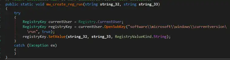 Like many other forms of malware, it employs registry run keys to establish persistence on the compromised host, ensuring its survival through system reboots.