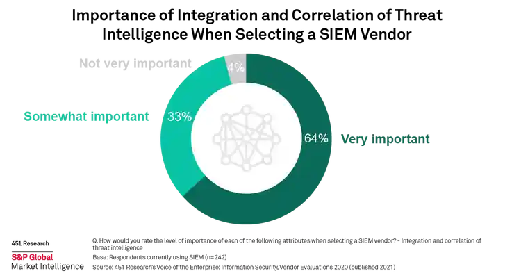 In late 2020, 451 Research conducted its Voice of the Enterprise: Information Security, Vendor Evaluations study, which included a worldwide survey of enterprises using the technology of security information and event management (SIEM) and security analytics. Published in early 2021, that survey’s findings called out two attributes of SIEM/security analytics vendors that were most frequently rated ‘very important’ by respondents: the quality of reporting and alerts, and the integration and correlation of threat intelligence.