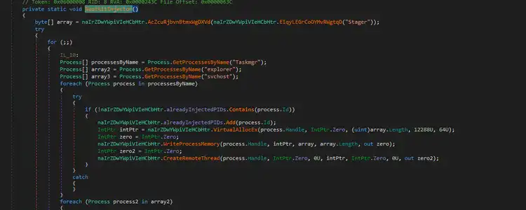 The resource directory entry named “Stager” contains shellcode that is injected into a target process whose name matches either Taskmgr, explorer, or svchost. Figure 13 shows a code snippet demonstrating how the stager performs process injection into these selected processes.