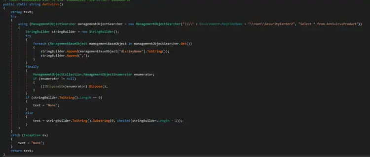As part of its software discovery phase, XWorm queries Windows Management Instrumentation (WMI). As shown in Figure 15, XWorm gathers information about antivirus products installed and registered with the Windows Security Center WMI namespace.