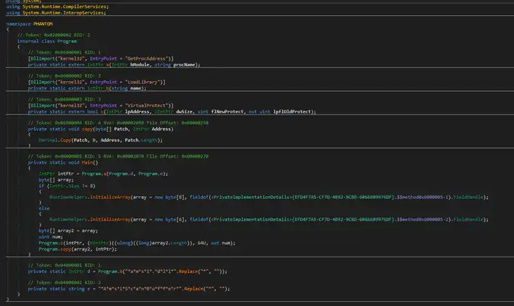 The first decrypted file is specifically designed to bypass AMSI (Antimalware Scan Interface), a Windows security feature that allows antivirus software to scan scripts and other content in memory before they run. To achieve this, the payload attempts to patch the AmsiScanBuffer() function within the amsi.dll library. By modifying this function in memory, the malware prevents AMSI from properly scanning or detecting malicious code, allowing its execution to continue without being flagged by security tools.