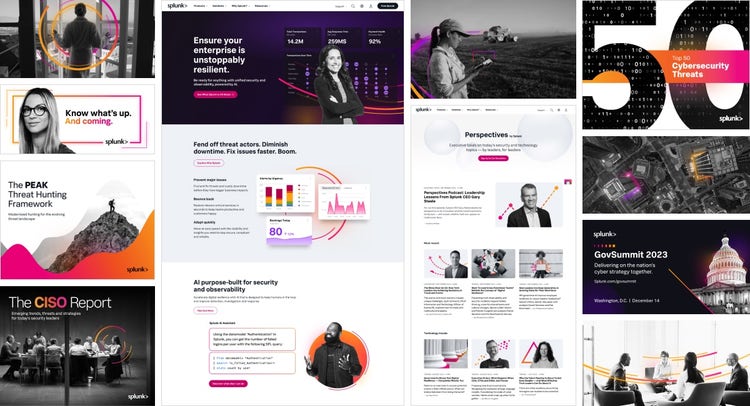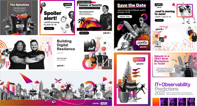 Great brands focus on simple stories that express their value and connect with audiences. They don’t try to sell everything and the kitchen sink. Less is more. Our visual expression was very bohemian. We had layers of collaged images and textures. We also had dozens of sub brands. As part of the refresh, we simplified our brand look and focused the resources and energy of all our products and programs up to the main Splunk brand, eliminating extra sub brands.