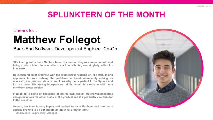 Ever wondered what it’s like to be a virtual engineering intern at Splunk? In this installment of our “Meet the Splunktern” series, we’re introducing Matthew Follegot, our Back-End Software Engineer Co-Op on the Security Analytics (UEBA Cloud) team. Matthew is an Engineering student at the University of Waterloo and was recently named Splunktern of the Month for embodying one of Splunk’s core values — innovative! Read on to get a sneak peek at Matthew’s day-to-day activities and responsibilities as a Splunktern.
