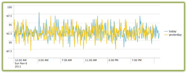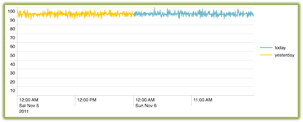 Recently a customer asked me how to show current data vs. historical data in a single report. It looks like the report below, where one line represents today’s data and another represents yesterday’s data. This makes it easy to see the relationship between data over any two time ranges.