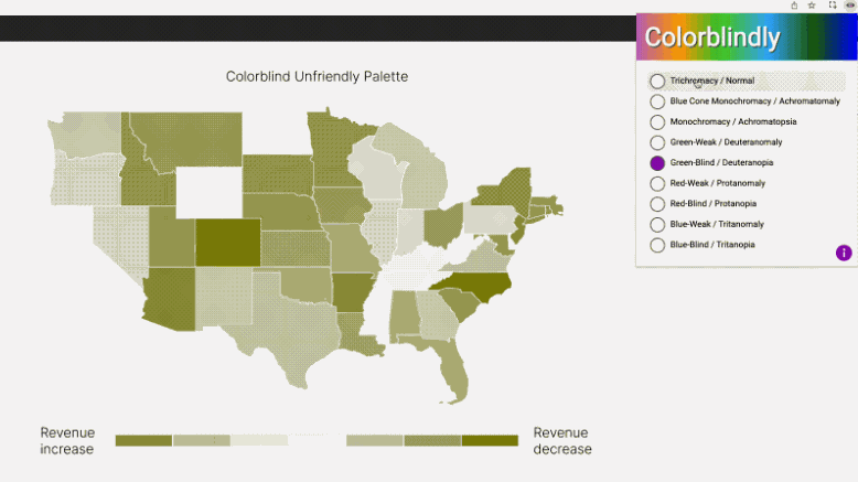 Choosing colors should take into account the common problem of color blindness. The following shows an example where lousy color palettes can cause perception issues for people with deuteranopia (red-green color blindness.) People with normal color vision can distinguish divergent red and green colors, but it's difficult for people with deuteranopia.