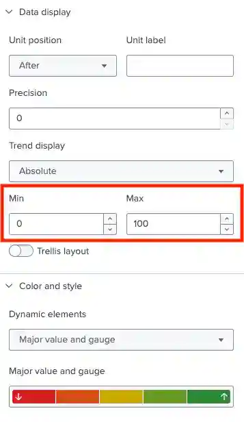 To change the min and max values of your radial gauge to something other than the default 0 and 100, you can do so under Data display: