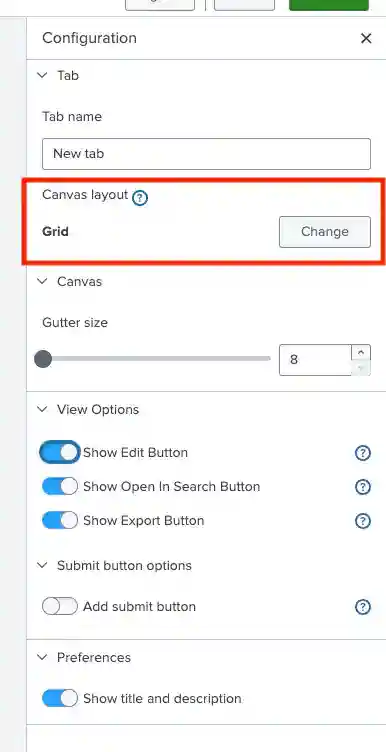 In the configuration panel, you can change the tab name and canvas options for that tab. Your dashboard-level settings like View Options and Preferences are still available to you at the bottom of the configuration panel.