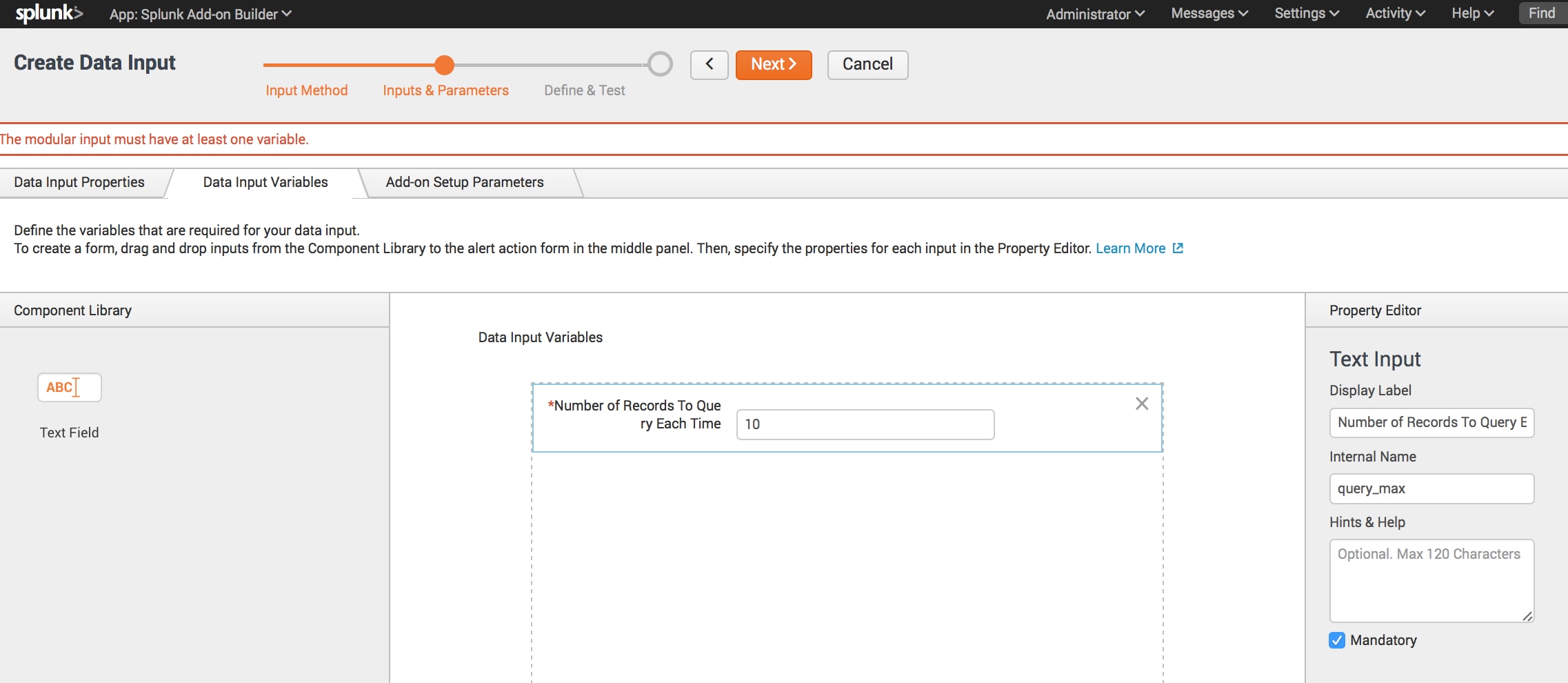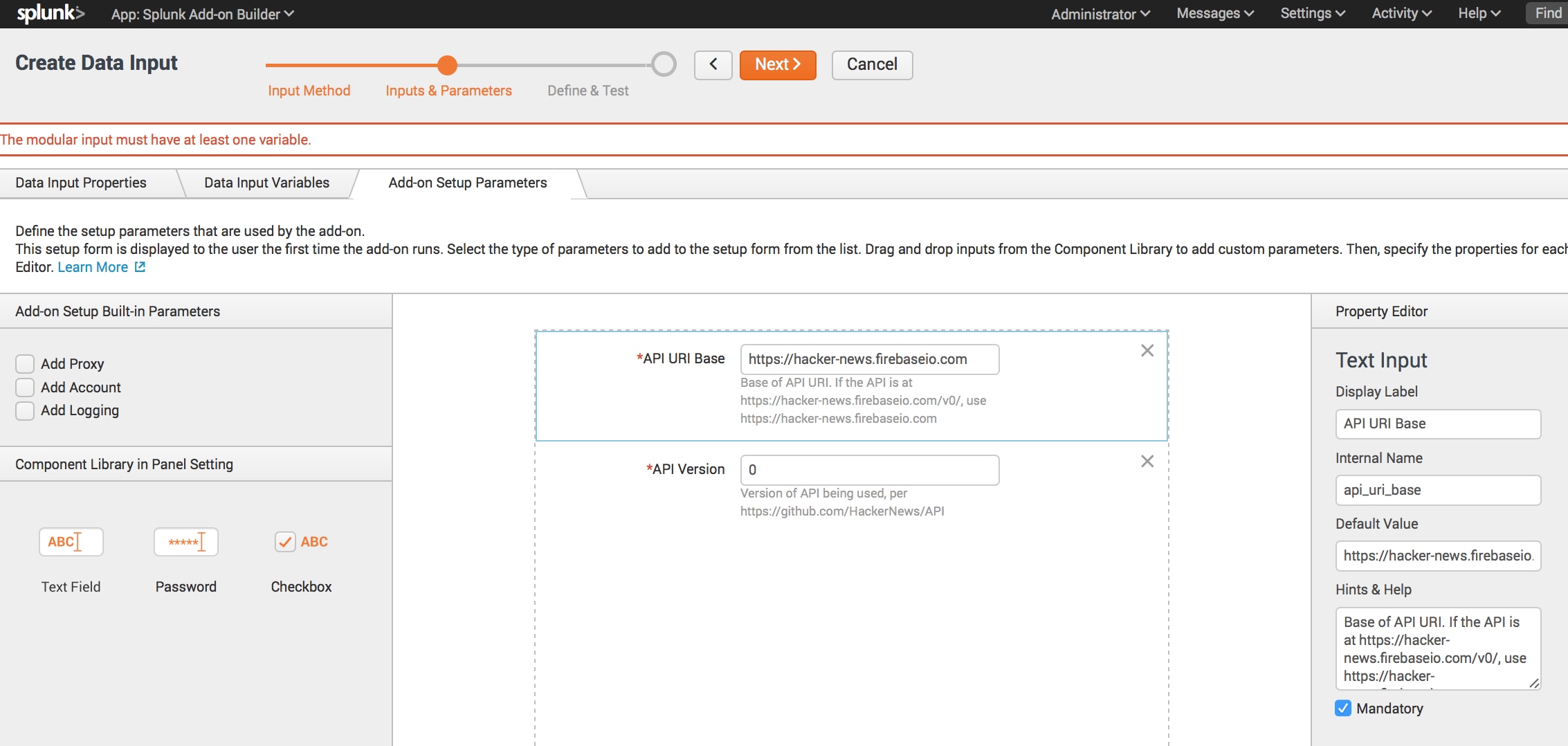 Finally, we’ll define the Add-on Setup Parameters. These are the global input parameters defined in the Add-on’s setup page. These will be the universal settings available to all inputs configured using this modular input.