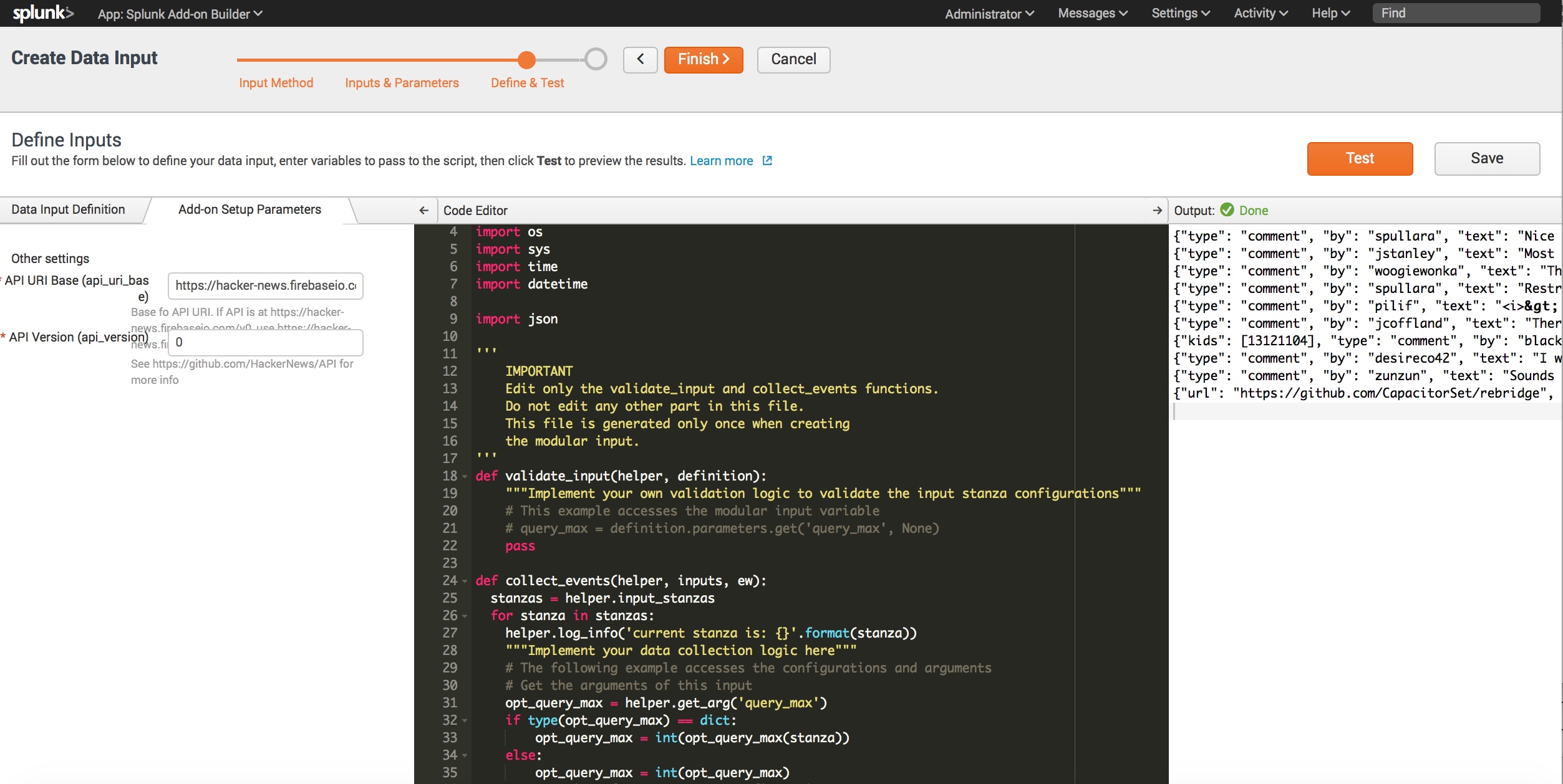 Be sure to update the forms on the tabs Data input Definition & Add-on Setup Parameters to the left of the Code Editor to make sure test mode has parameters with which to work.