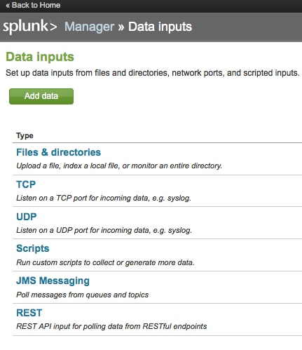 Configuration is via navigating to Manager->Data Inputs->REST