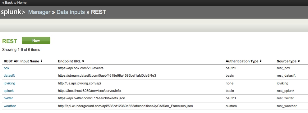 And then clicking on “New” to create a new REST Input. As you can see below , I have already created several that I used for testing.