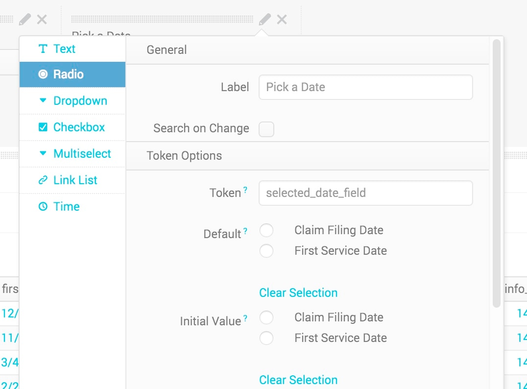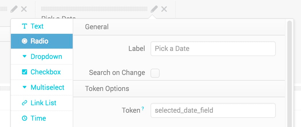 In the panel editor, add a drop down and let’s give it a Label of “Pick a Date” and a Token Name of selected_date_field.