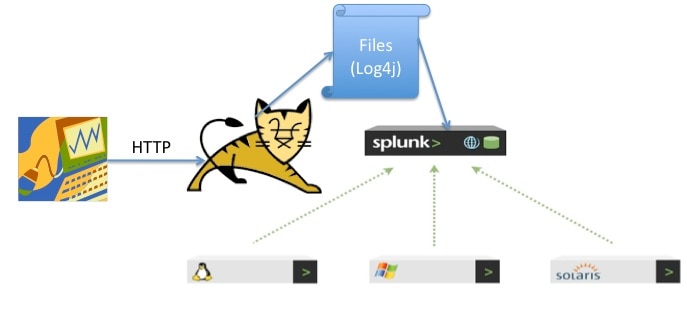 The approach I’ve implemented is to first create a simple Java Servlet, deployed into a Servlet container such as Apache Tomcat, that receives either HTTP POST or HTTP GET requests. The Servlet can then be configured to either write to the standard logging framework for Apache Tomcat or use Log4j to log each event to a rotating file. Splunk can either index the data directly from the file system or a forwarder can be installed on this machine to send the data to a remote indexer. This is pictorially depicted below. The green arrows are the traditional Splunk Forwarders. The cat, of course, is Apache Tomcat.