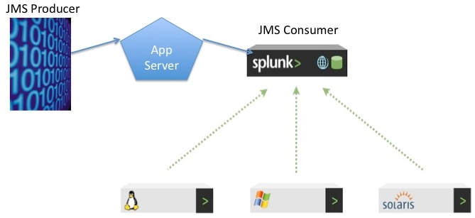 Use Case 1: An application server such as IBM Websphere or Oracle WebLogic is running on a Mainframe and it produces messages or events to a JMS destination. Since Splunk Forwarders currently do not run on Mainframes, the application can use a JMS producer to send an event to a Queue. The JMS Consumer running remotely on the same machine as Splunk, started as scripted input, can now consume messages from this queue and send them to Splunk via standard output.