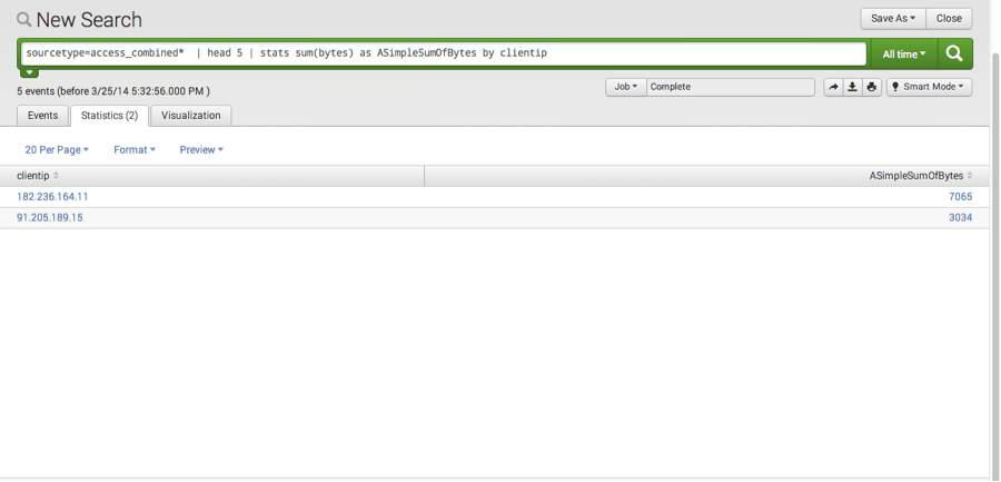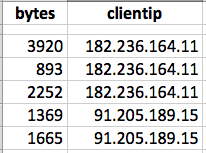 So let’s look at a simple search command that sums up the number of bytes per IP address from some web logs.