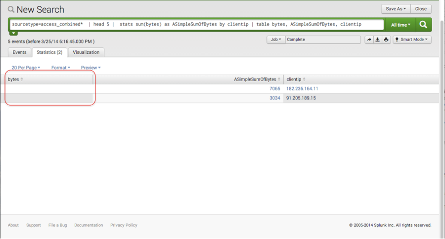 Hmmm. What happened to my bytes field? Also explained in the documentation is the anatomy of a search. With each Splunk command or term, an intermediate table is produced without the user having to issue any command to allocate the tables. If we wish to add any of the original fields (like bytes) or perform additional calculations on original fields, they would have to be placed before the stats command. See what happens in the screen shot above when we try to add the bytes field to the end of the search command string. This will make the use case for eventstats.