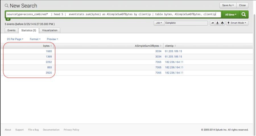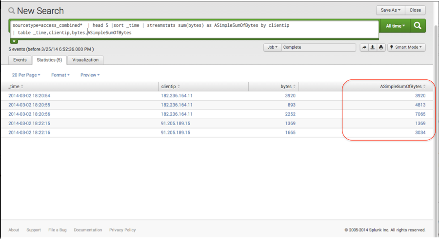 sourcetype=access_combined* | head 5 | stats sum(bytes) as ASimpleSumOfBytes by clientip | table bytes, ASimpleSumOfBytes, clientip