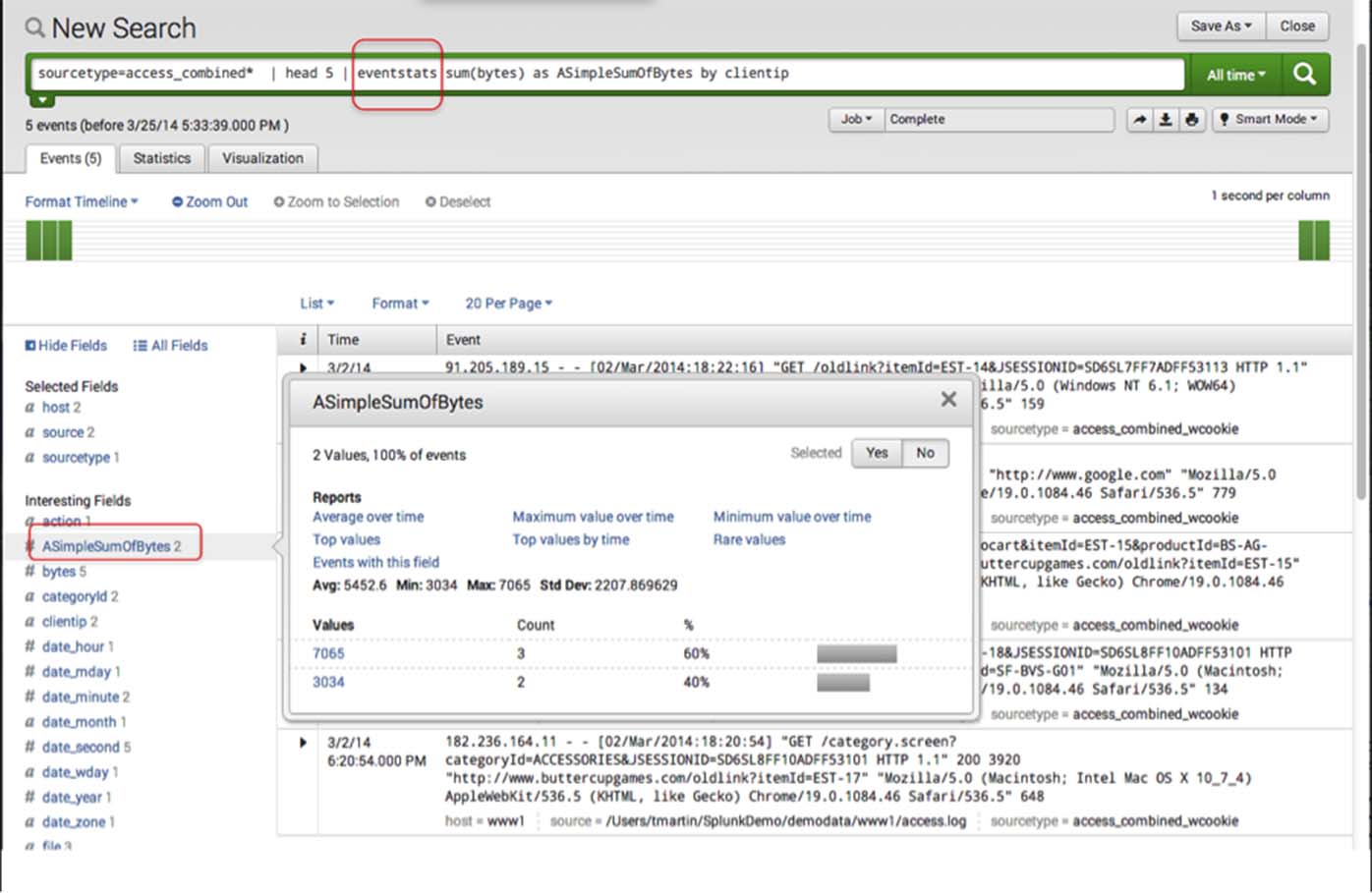 Now just like stats there are two values ( one for each clientip ) for ASimpleSumOfBytes, but they are aggregated to the raw events and can be used for later calculation. Just a note, your raw data is untouched. The aggregation is just a presentation feature that you get with eventstats.