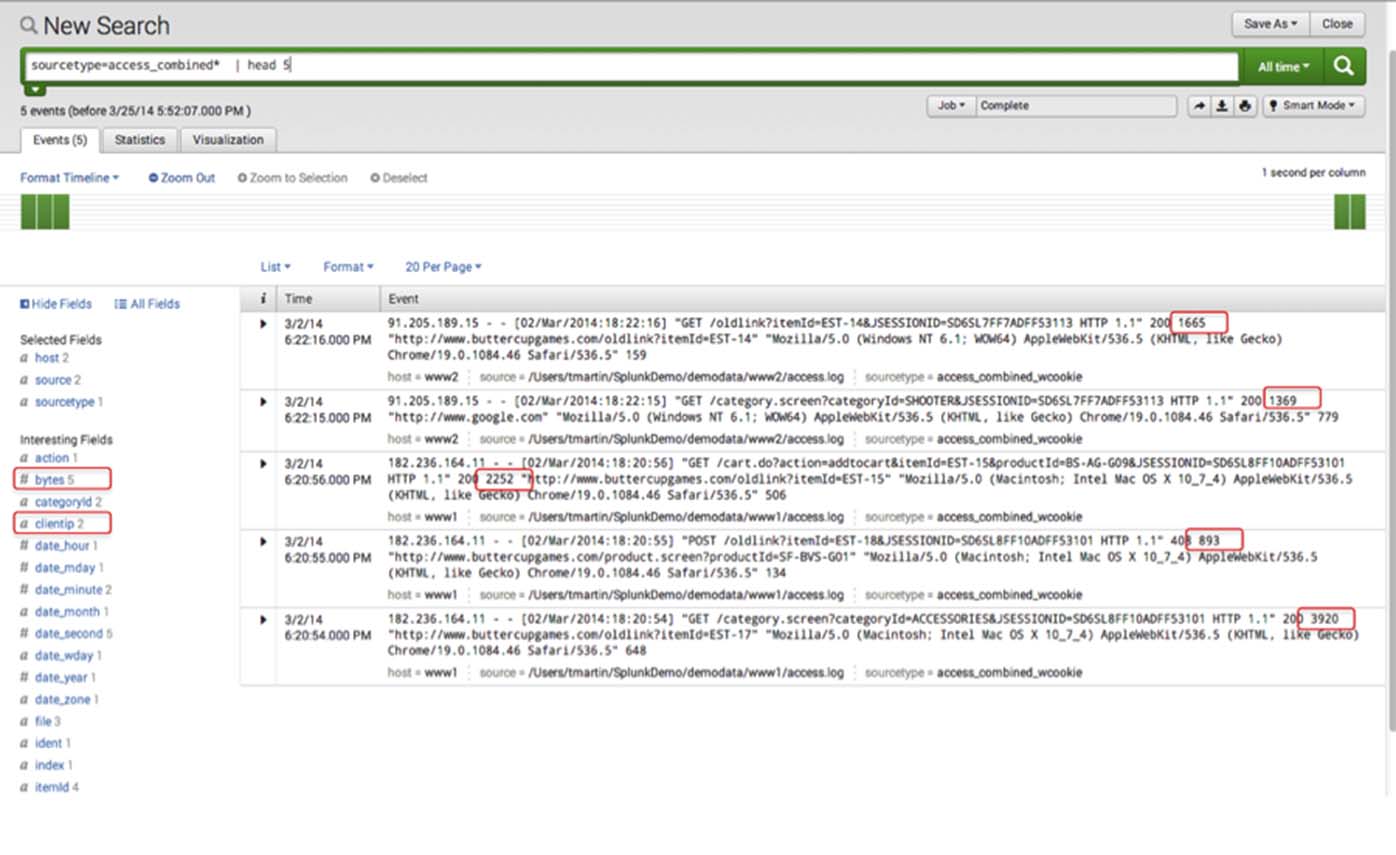 To begin, do a simple search of the web logs in Splunk and look at 5 events and the associated byte count related to two ip addresses in the field clientip.