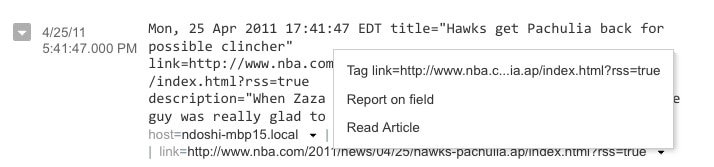 You get the title and description of the news item and access to its corresponding web page right in the same dashboard. (This was built using previous work I had done with indexing RSS feeds and using Splunk as a RSS reader.) If you scroll down, you will see more RSS feed events and another corresponding web page. You can download this app from Splunkbase and have it running in your Splunk server in no time. Since the interval to collect RSS data is set to 1 day, very little data is collected. You can change that interval in the app to be less time, if needed. The other feature is that you can click on a title and get to the raw news event in Splunk. By using the field picker to select the link field, you can then use the pull down menu item “Read Article” to read the news article itself.