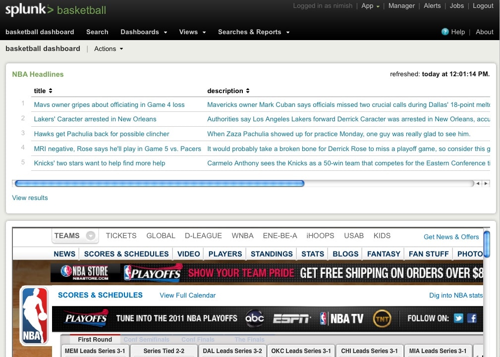 As I write this, the NBA Basketball playoffs are under way and some of you may be interested in what is currently happening with the sport. If you are a Splunk user, it may be worthwhile to take a break while you send a search to the background and get the latest playoff news and standings from Splunk Web itself. To meet that objective, I’ve created a simple XML dashboard which shows the latest RSS headlines from NBA.com and ESPN in 2 different panels with their respective web pages in iFrames. In this manner, I can do my Splunk work and also jump to this basketball app to catch up with what is going on in the NBA. Here’s a snapshot of the app.