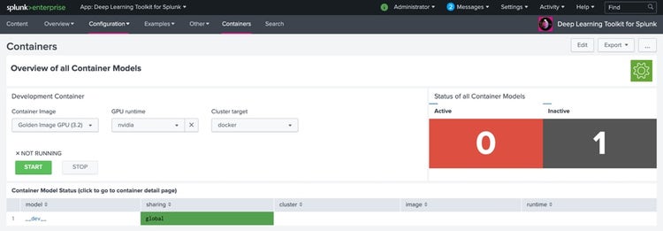 Once you have successfully connected Splunk to the remote docker instance go to Configuration -> Containers and start the golden image with the GPU runtime option set to nvidia (if you haven't done so already).