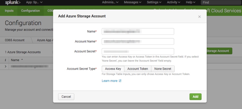 After installation of the add-on, connect the add-on to the Azure Storage Account specified above.