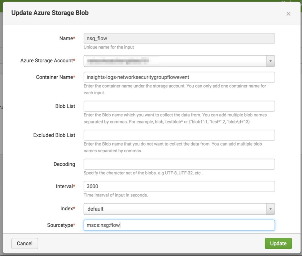 - Setup the Splunk Add-on for Microsoft Cloud Services to read the NSG Flow logs from the specified Azure Storage Container from step 1