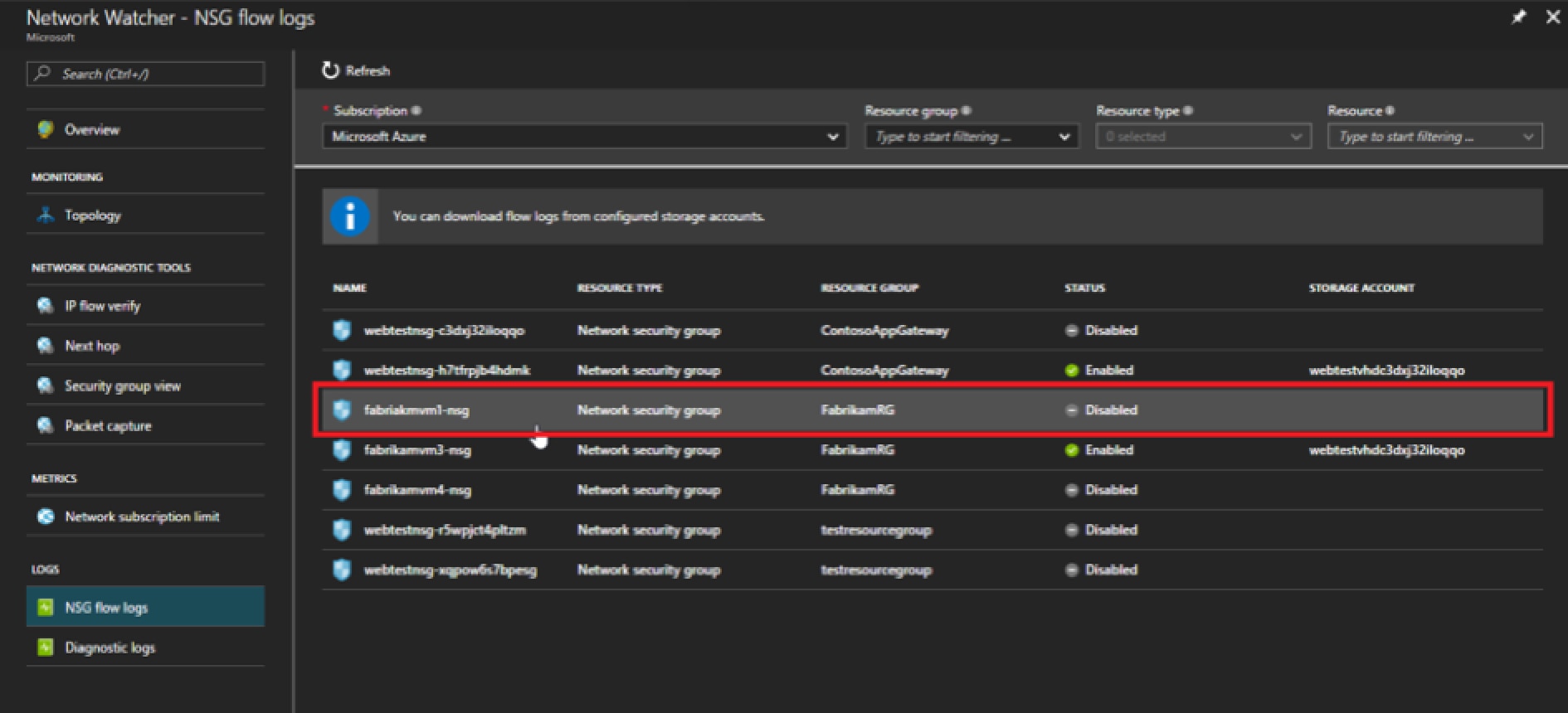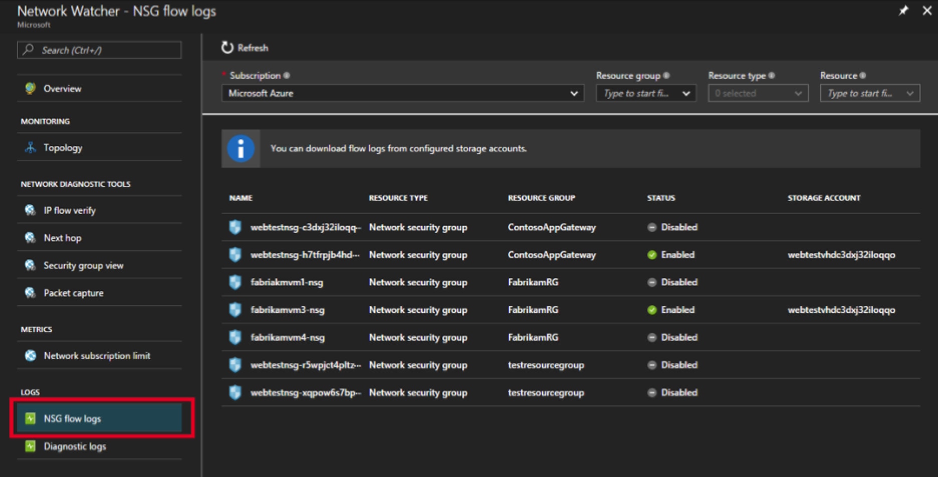 From the Azure Portal, navigate to a Network Watcher instance and select Flow Logs