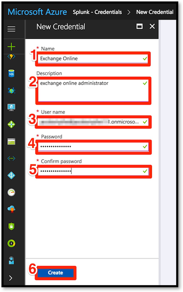5) User must have sufficient access to be able to access exchange message trace functions. Enter Name, Description, Username, Password, confirm Password and select Create.