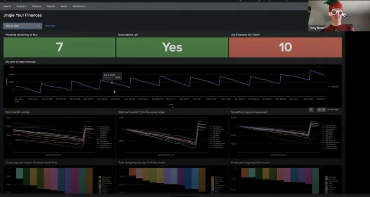 Our friendly elf, Tony, demonstrates the art of the possible by using Splunk to analyse personal financial data. By leveraging Splunk’s ability to process, visualise, and alert on data in real-time, Tony shows how you can stay ahead of your finances during the holiday season.