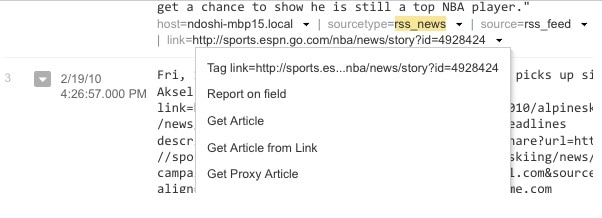 Essentially, what this does is turn Splunk Web into an RSS reader as it first indexes RSS events using the RSS application and then allows you get to the article’s contents using the workflow actions. You can get this add-on from Splunkbase.